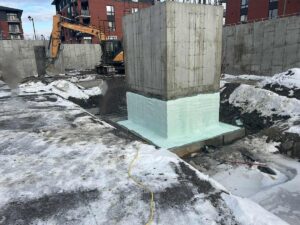 The integrated foam–polyurea interface ensures long-term adhesion and system continuity under dynamic soil and groundwater conditions, delivering a technically superior blindside waterproofing solution with optimized performance, reduced labor, and predictable, long-term reliability compared to conventional blindside applications.